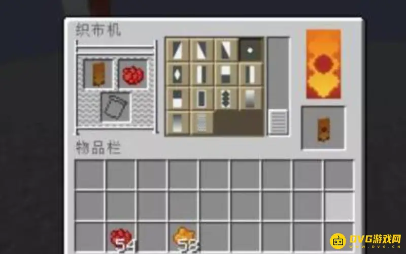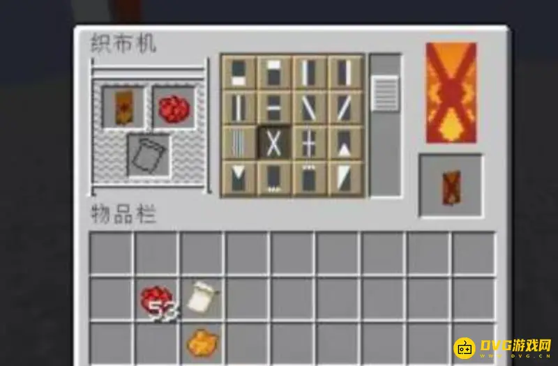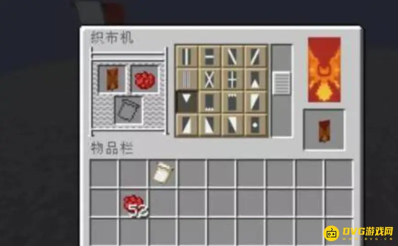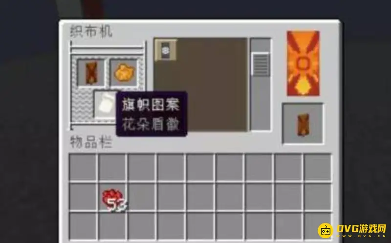 6.使用织布机把染上红波纹边、橙色自上渐淡、红色圆形、红斜十字、橙色花朵盾徽图案的黄色旗帜,染上红顶三角图案,这样就大功告成了。
