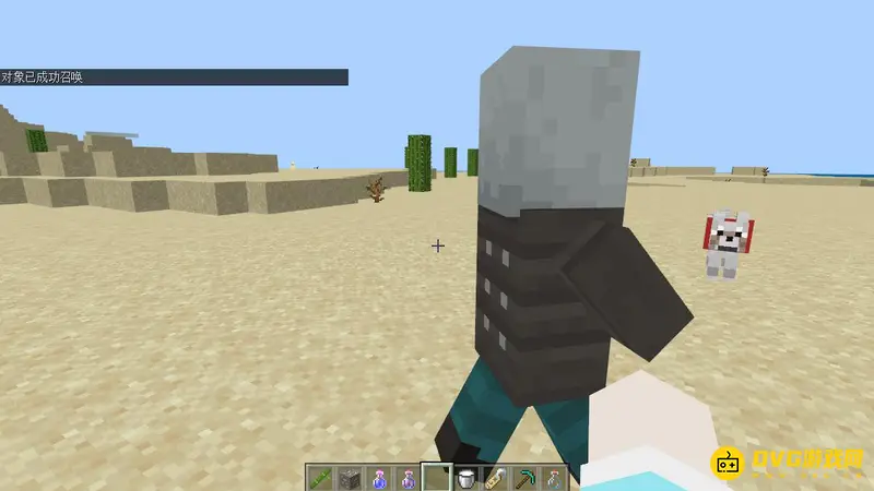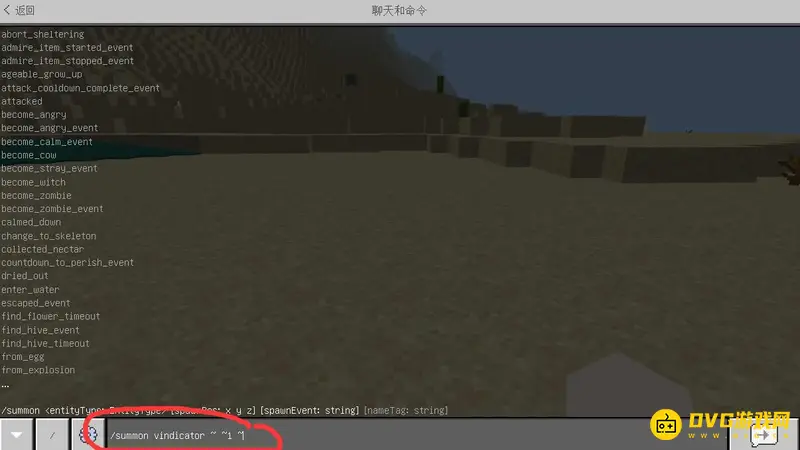 1,输入指令/summon vindicator ~ ~1 ~即可生成一只卫道士,我们可以按T打开聊天框,输入这条指令。