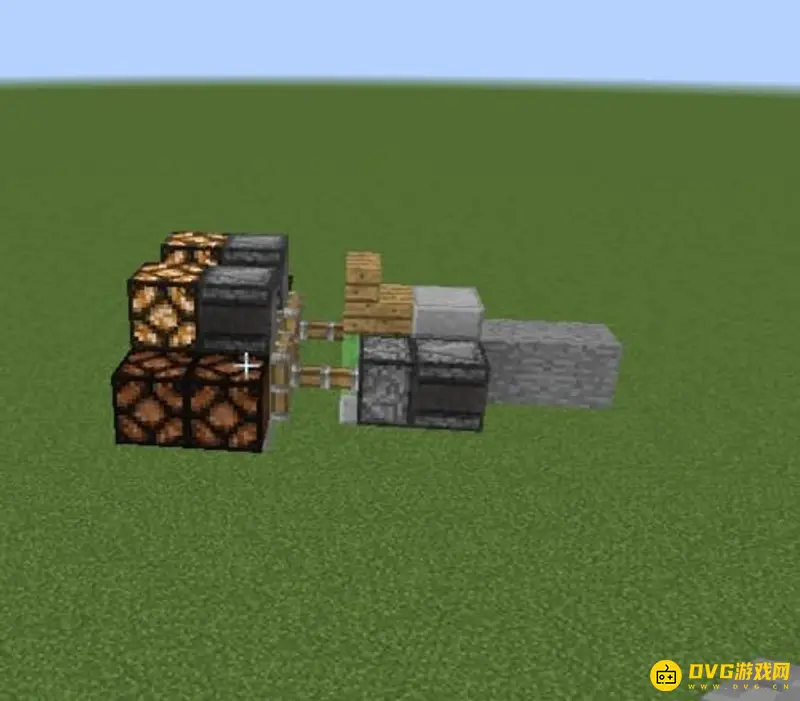 8、作为机头的粘液块前方放两个石头。楼梯前方的粘液块上方放一个半砖。