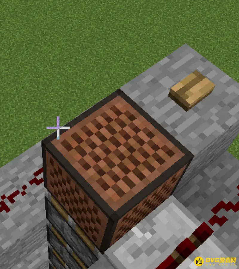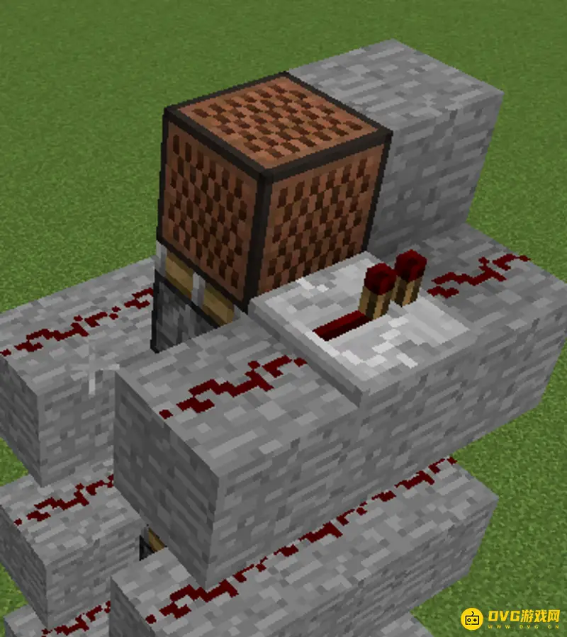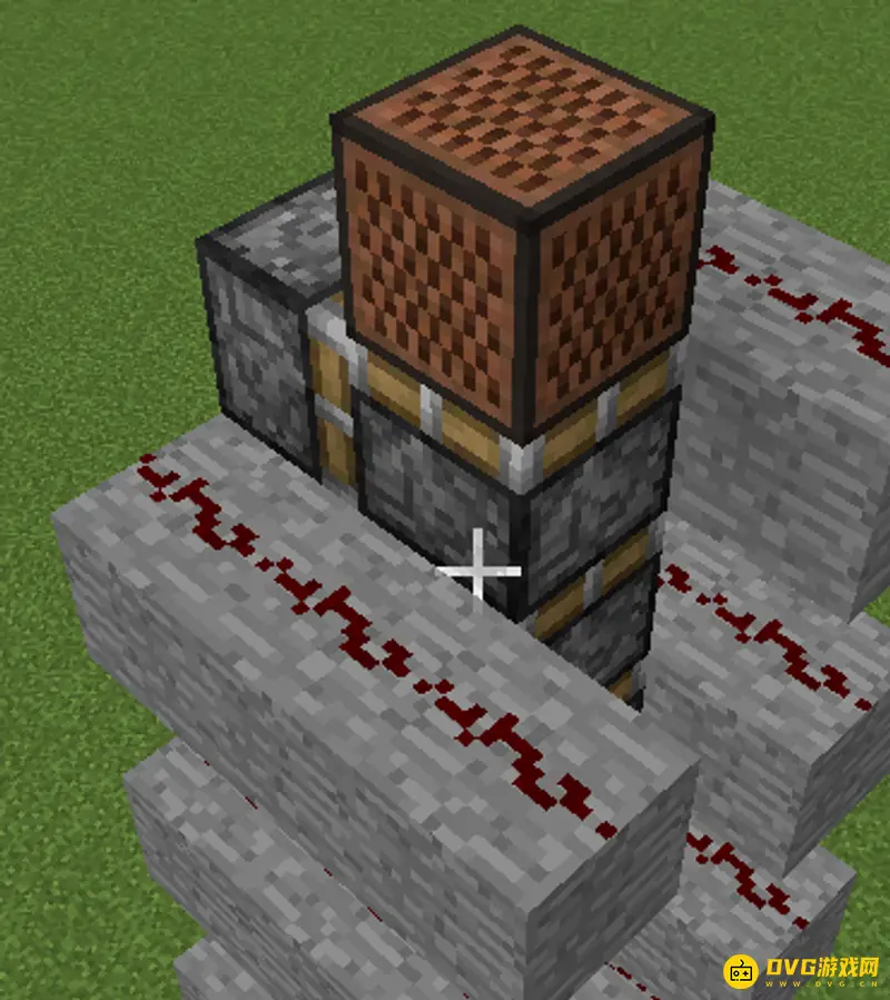 6、最顶层的活塞上方放一个不可移动方块音符盒。