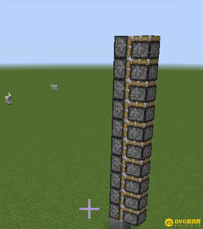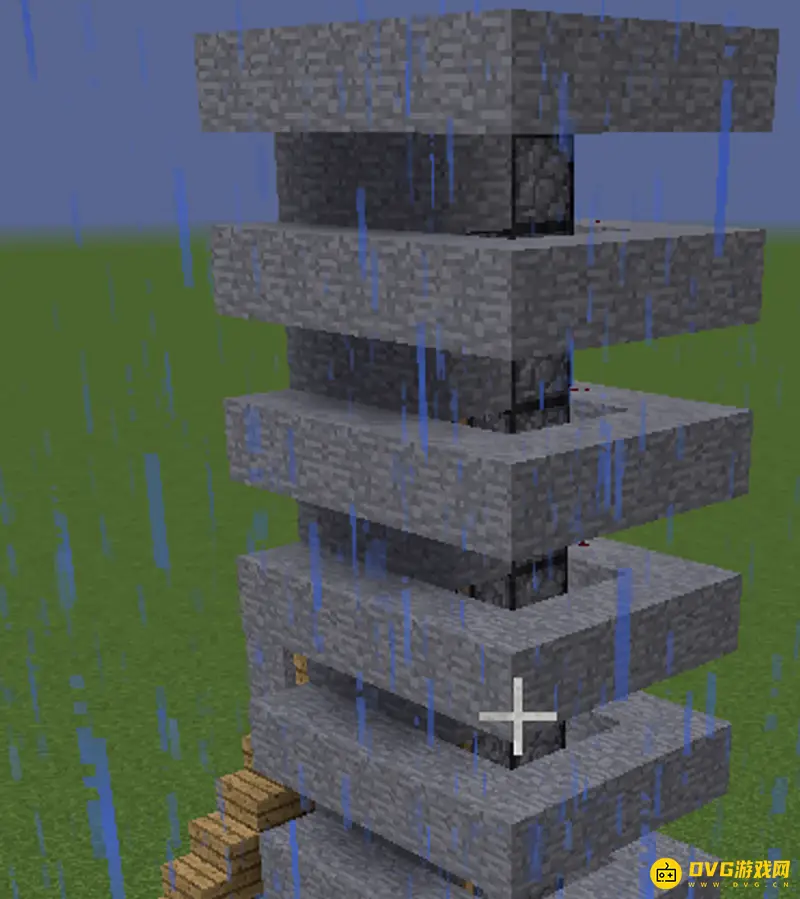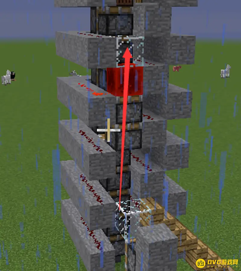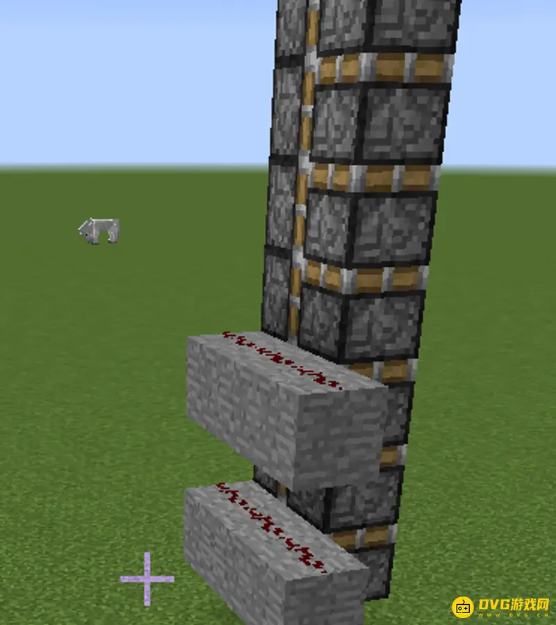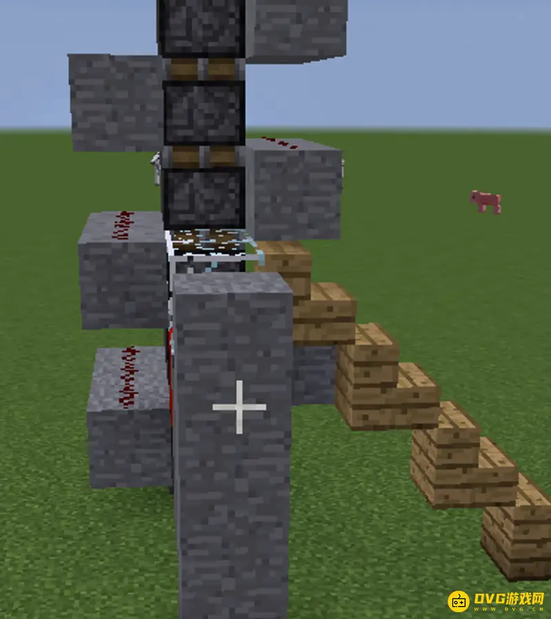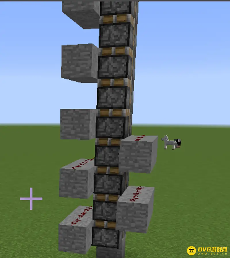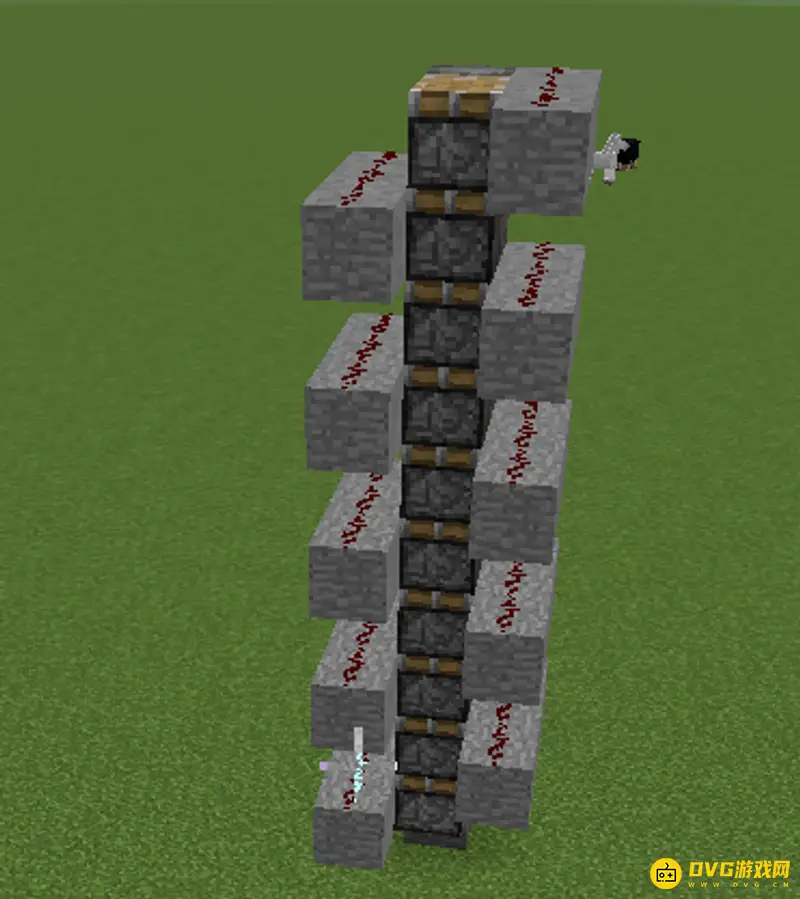 4、按照这样的方式向上,一直铺。然后另一侧跟左侧叉开,也是同样的方法放石头与红石。