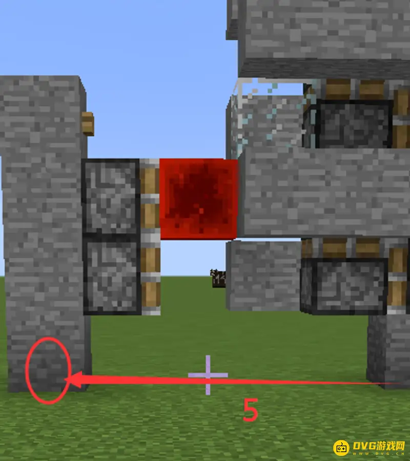 9、最底层的石头距离5格的地方放4个石头,石头中间位置放两个活塞,活塞上方放一个按钮,第二个活塞前方放一个红石块。