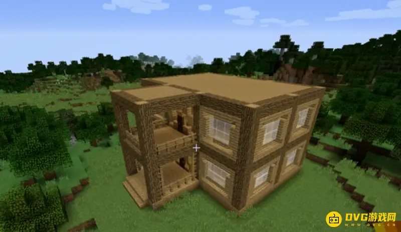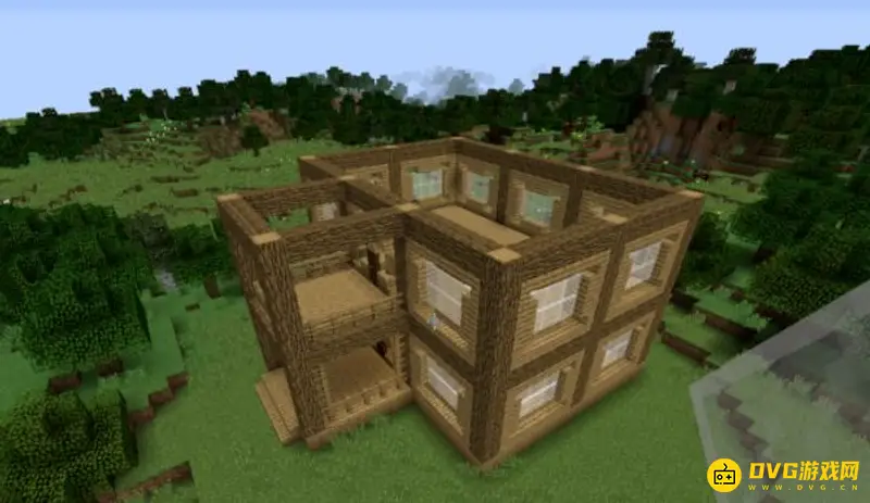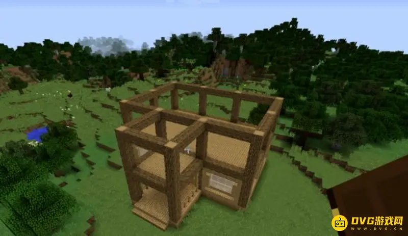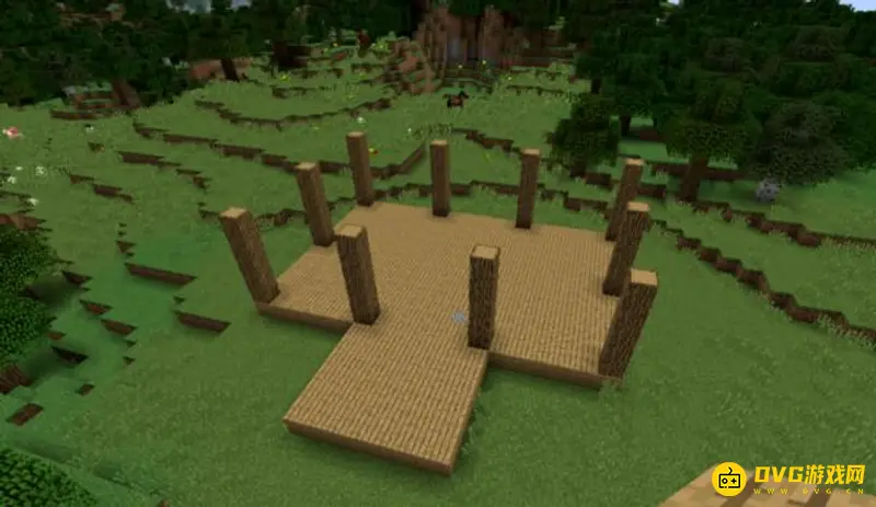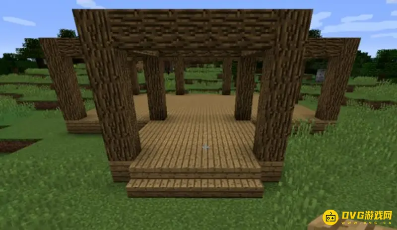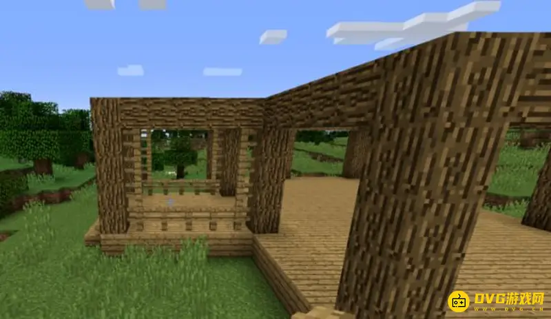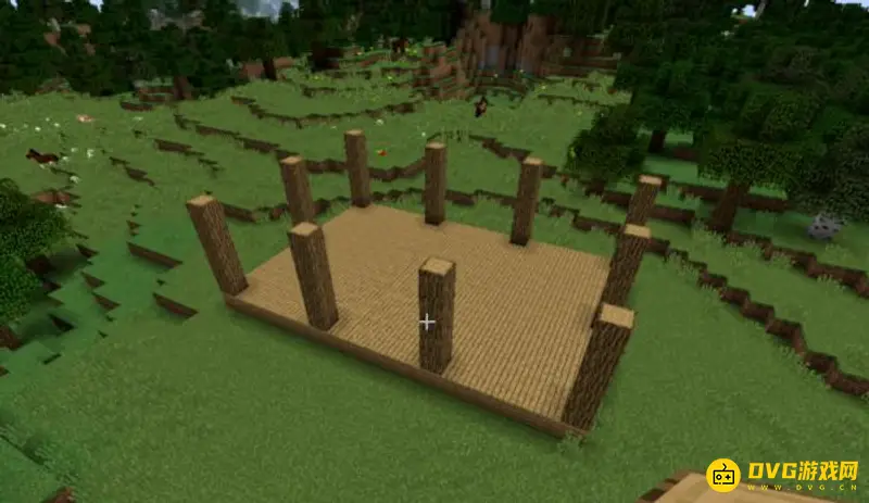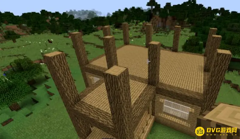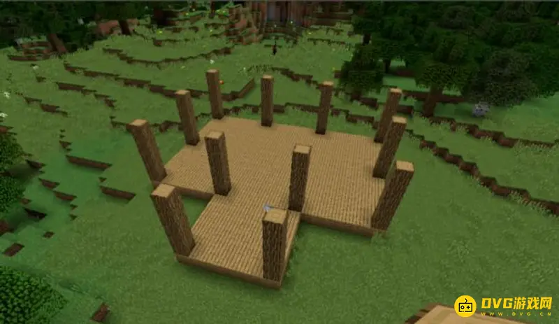 2、然后沿着边缘每隔五格搭一根五格高的原木柱子(顺便说一下,这个建筑除了屋顶都是橡木的)。