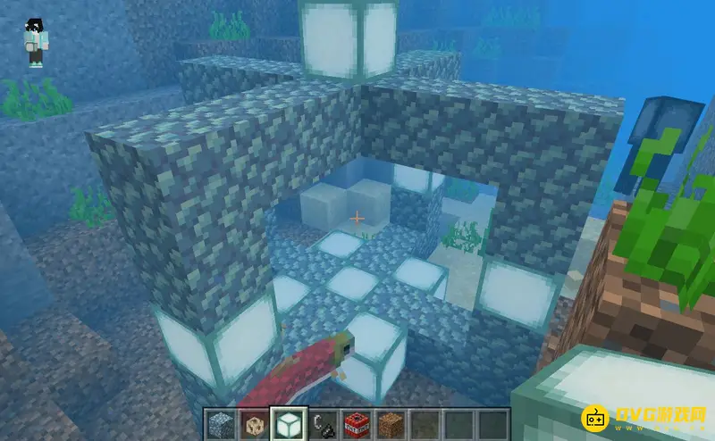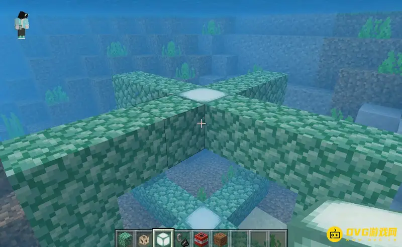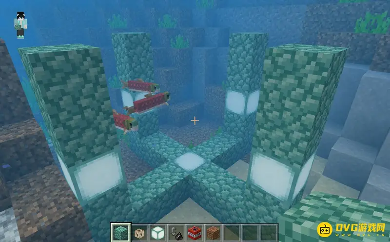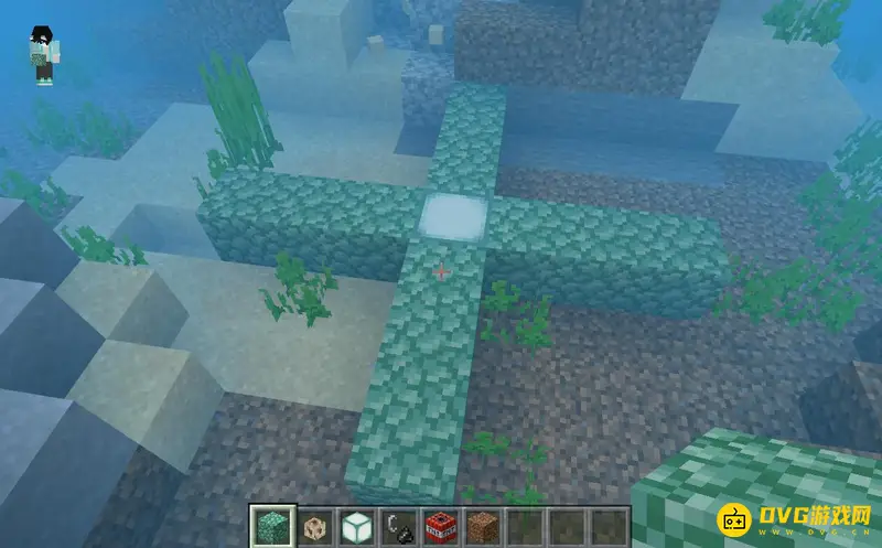 1,首先我们需要按照如图摆放一个地基,是由海晶石和海晶灯构成的。