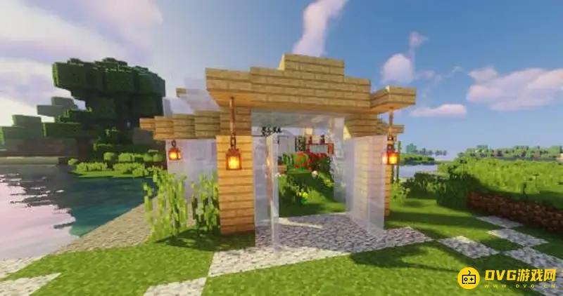 9、用白色玻璃做一个开着的门,周围用草丛和灯笼装饰一下