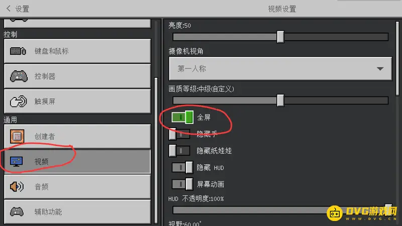 2,然后点击左侧的视频,开启右侧的全屏按钮就可以开启全屏无边框了。