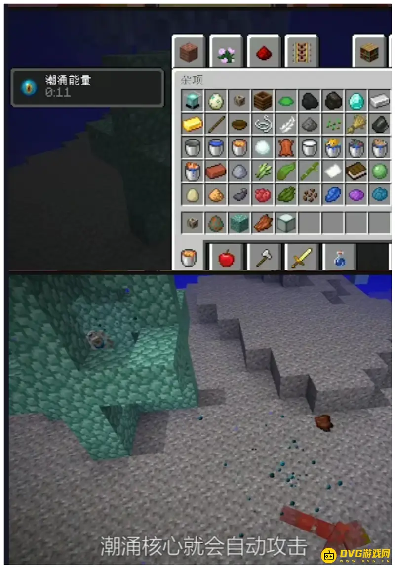 海洋之心与鹦鹉螺壳合用可以被制作成潮涌核心。激活后的潮涌核心可以给予玩家潮涌能量,玩家会直接拥有水下呼吸效果、水下夜视效果等效果。完整的潮涌核心(用海晶石激活后搭建而成)能够自动攻击周围的溺尸和守卫者,具有有效的保护作用。