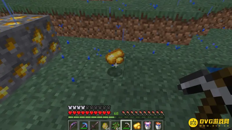 1,例如我们可以用铁镐来采集金子,首先我们拿着铁镐左键按住金矿石。