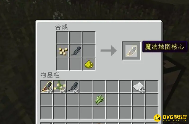 6、将乌鸦羽毛和火炬浆果以及萤石粉放到一块,然后如下图所示的摆放,合成魔法羽毛,然后就可以合成出魔法地图的核心;