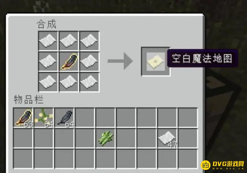 7、有了魔法地图核心,接下来就可以制作魔法地图。先将魔法地图核心放在工作台的最中间,然后摆上8张纸如下图所示就能制作出暮色森林地图;