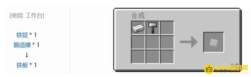 使用一个铁锭和一个锻造锤,在工作台处就可以合成出一个铁板了,铁板是可以合成的基础材料,是很多精密器械的合成材料之一,比如说范围触发器,钛铁合金板。