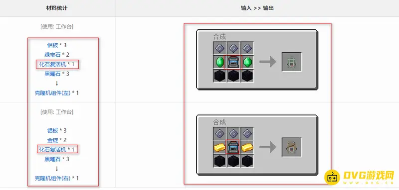用法为铝板 * 3 绿宝石 * 2 化石复活机 * 1 黑曜石 * 3,可以合成克隆机组件(左) * 1,铝板 * 3 金锭 * 2 化石复活机 * 1 黑曜石 * 3,可以合成克隆机组件(右) * 1。