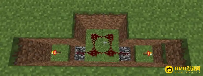 2、之后两边放上红石火把,其余位置铺上红石,多出的格子铺好放上压力板。
