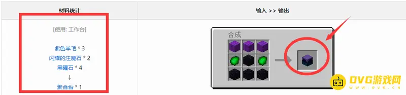 在我的世界虚无世界中使用工作台和材料:三个紫色的羊毛和两个闪耀的注魔石和四个黑曜石,按如下图所示的摆放位置就可以合成聚合台。
