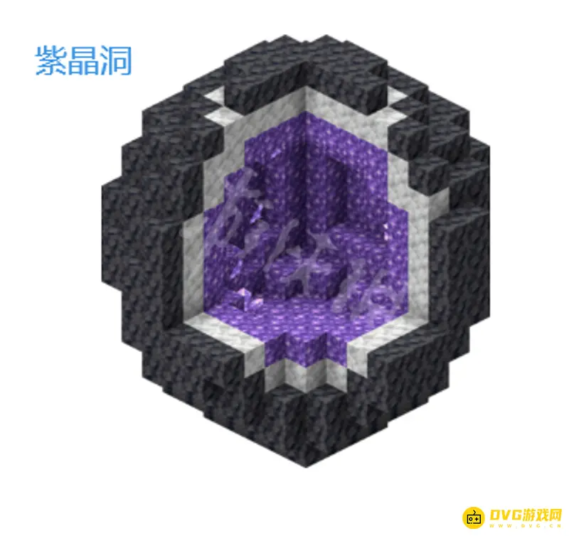 紫晶洞穴会在主世界Y=70和基岩层之间的区域罕见地生成。每个区块有1/53的几率生成紫晶洞。它们生成时仅会覆盖废弃矿井和洞穴,同时也有可能被其他结构覆盖。紫晶洞的Y轴生成范围比海床高,因此在深海中很容易找到从海床上露出来的紫晶洞。