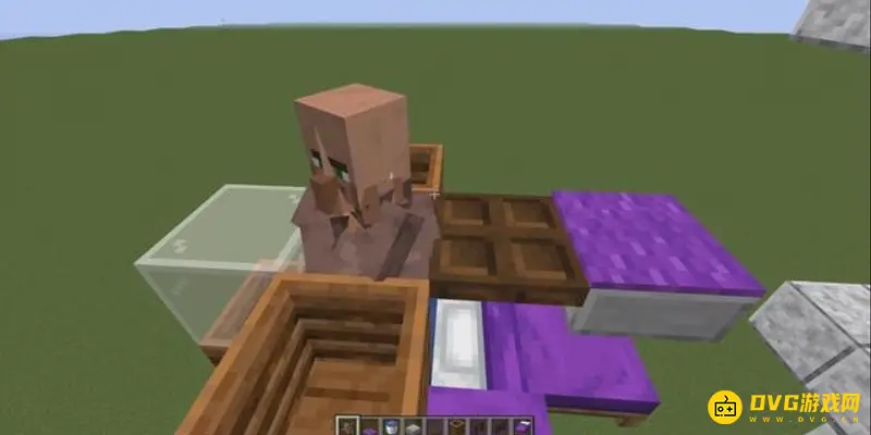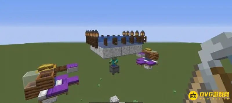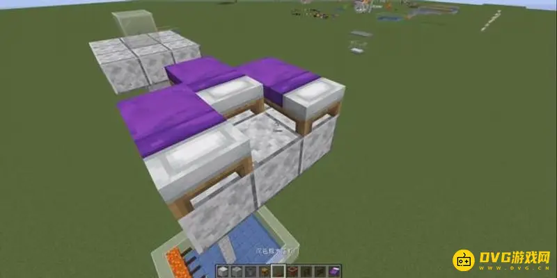 4、接下来我们就要进行村民的布置,村民的位置要放置在大平台的两边略低处,和我们前面预留的小平台持平,用凸字形方块搭建法,放置三张床,然后把村民的职业方块放置在床边,预留一个活版门作为孔洞,方便我们把村民放进去,这个职业方块建议使用村庄里常见的堆肥桶,如图设置就好。