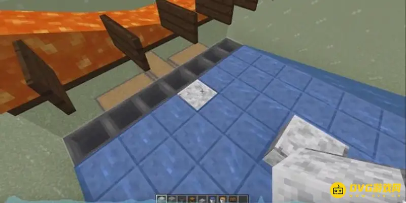 2、利用水流机制,我们在平台搭建好之后制作一个单向流动的水流,这个水流的结尾处要和漏斗相互连接以保证物品流进箱子里,接下来就是制作用于伤害铁傀儡的岩浆地带了,岩浆可以被木牌分隔,所以在水流的中央部分防止木牌来使岩浆悬浮在半空中,这样就可以在铁傀儡经过的时候对铁傀儡造成伤害,做完了这一些我的下层建筑就差不多做好了。