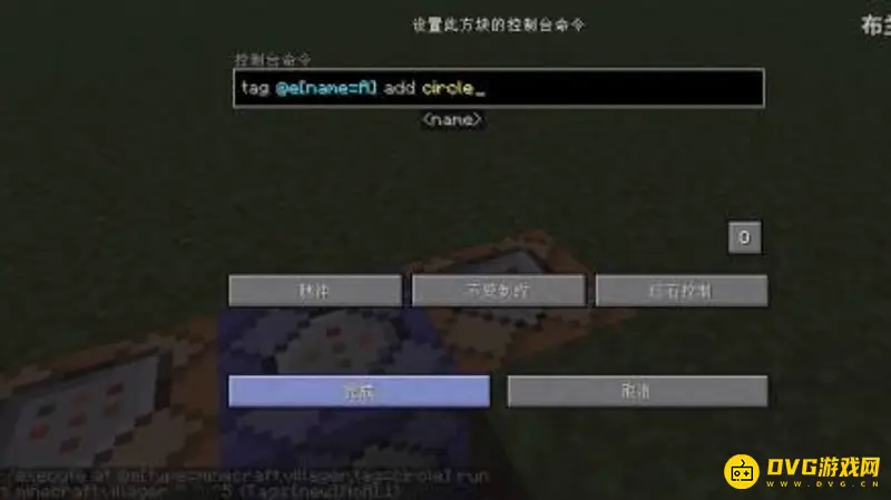 4 .继续在控制台命令里输入tag@e[name=A] add aircle代码,之后点击完成
