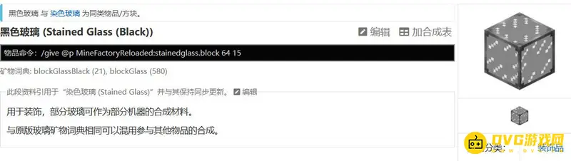 黑色玻璃英文代码是/give @p MineFactoryReloaded:stainedglass.block 64 15,黑色玻璃可以用于装饰,也可以作为部分机器的合成材料之一。