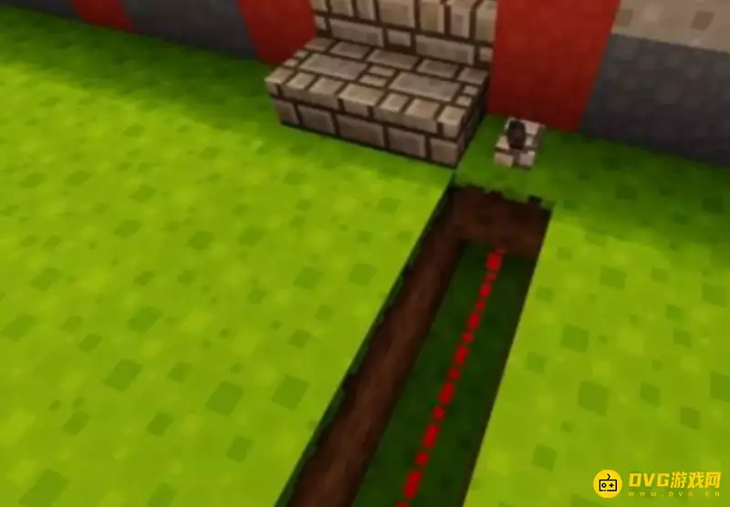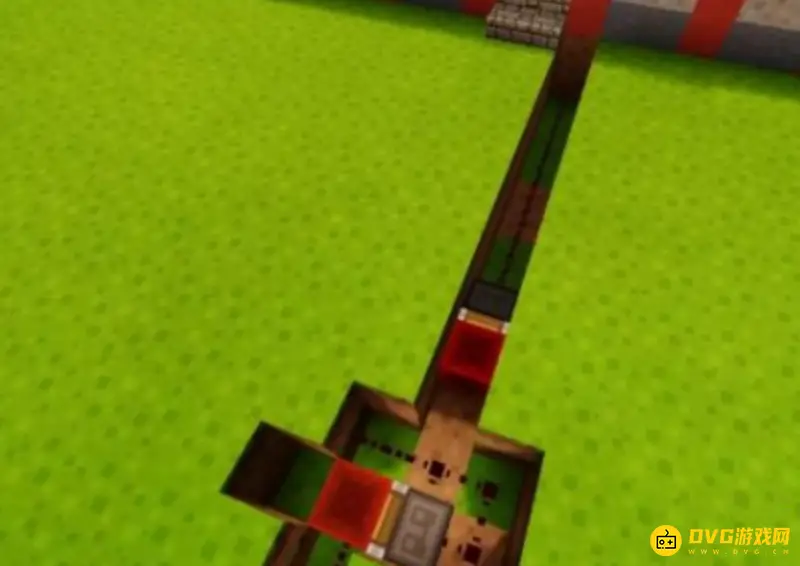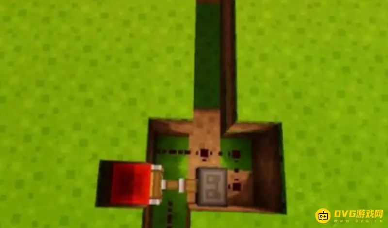 8、在通道的末端地面上放上草方块,并在草方块上放置一个拉杆。然后将拉杆拉下,就可以看到红石线路已被激活,永动机不再动了。