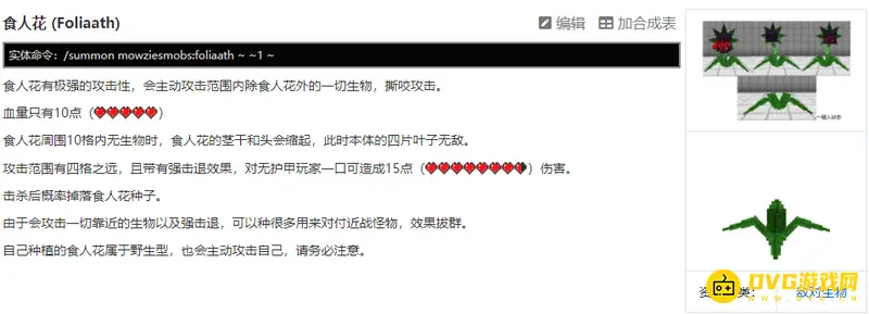 有食人花。主要是在MOD“Mowzie的生物”中出现。它作为一种和玩家敌对的生物,自身具有极强的攻击性,会主动攻击范围内除食人花外的一切生物,撕咬攻击。