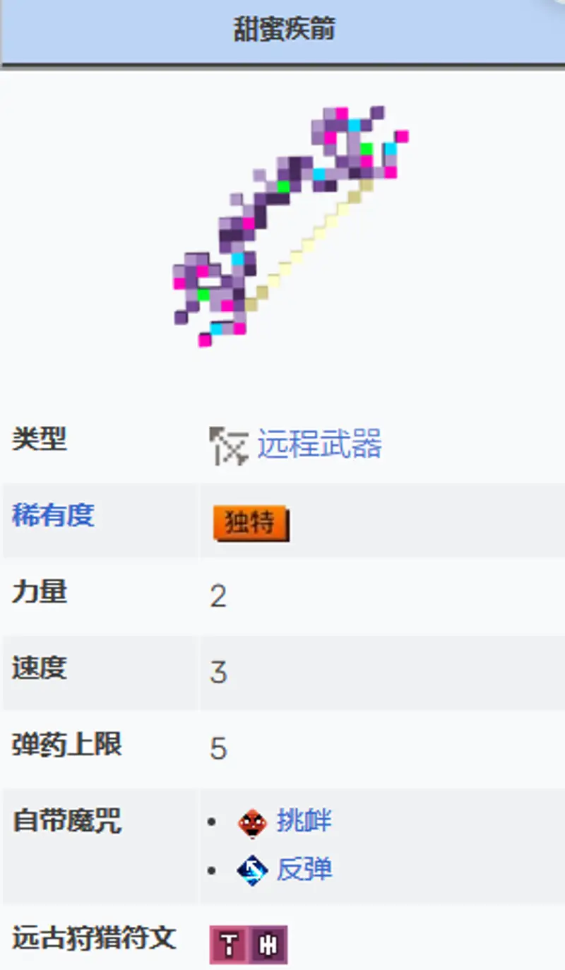 2.甜蜜疾箭(Sugar Rush),是捣蛋弓的特殊活动变种。拥有很低力量,低攻击速度和较低弹药上限。初始弹药量为66。