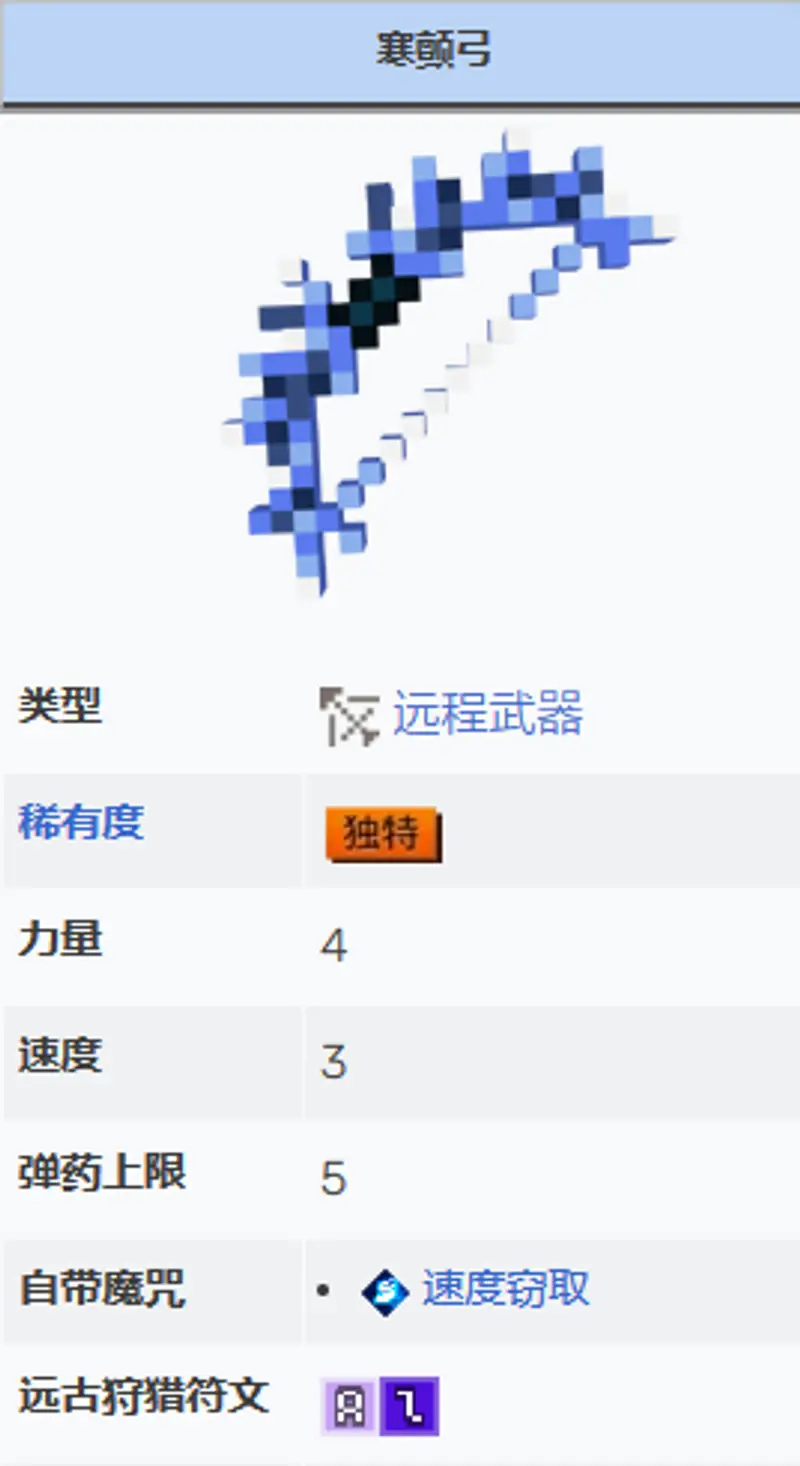 2.寒颤弓(Shivering Bow),是光灵弓的特殊活动变种。拥有低力量,低速度和较低弹药上限。初始弹药数为66。