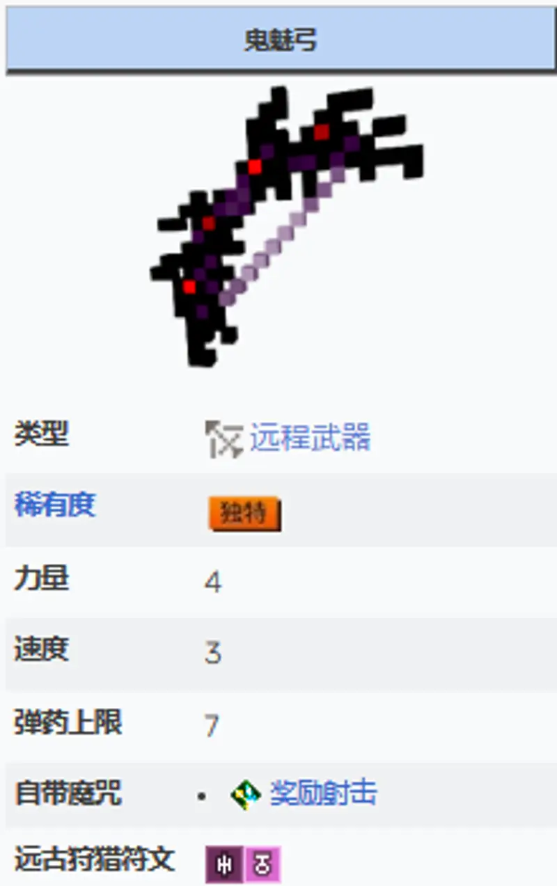2.鬼魅弓(Haunted Bow),是弓的变种。拥有低力量,低速度和中等弹药上限。初始弹药数为80。