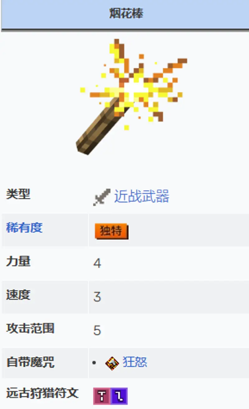 1.烟花棒(Sparkler),是弯刀的特殊活动变种。有较低力量,低攻击速度和较低攻击范围。攻击方式与弯刀无异。