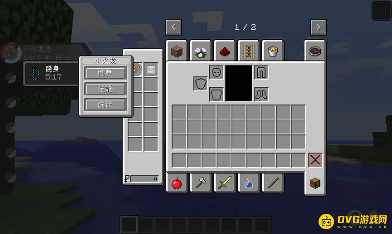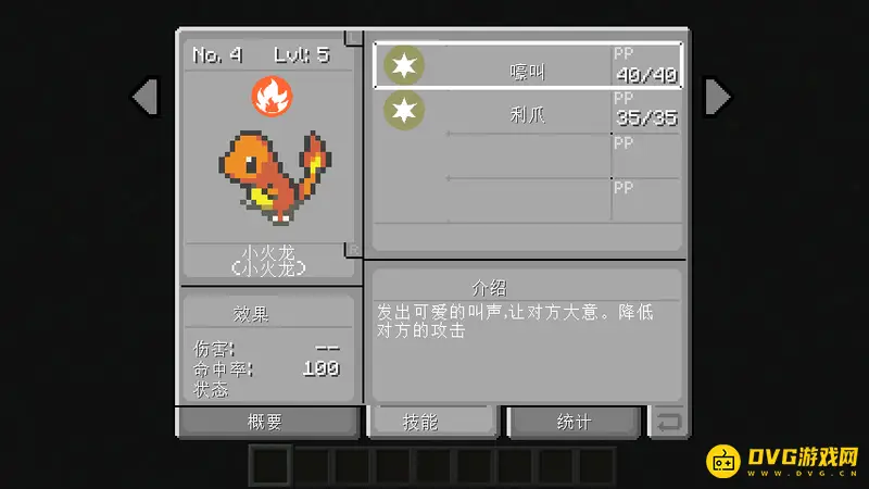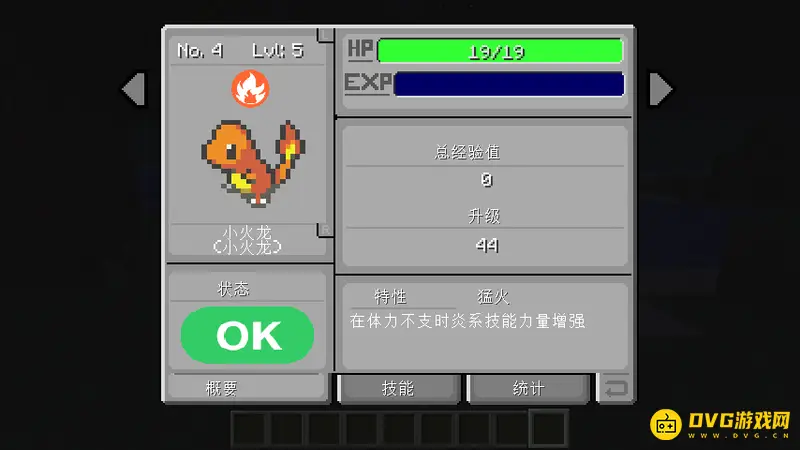 3、或者你也可以按‘E’键打开物品栏,你便可以看到左边的口袋妖怪对着任意一只口袋妖怪右键点击‘概要/技能/统计’3个任选一个即可。(可以看到‘口袋妖怪’旁边还有一个像‘包裹’一样的格子;用于放置道具.而‘口袋妖怪’最下方的有个类似钱的图标的为‘金钱’通过击杀训练师或者口袋妖怪获得,用于在商店购买道具或者宝石。)