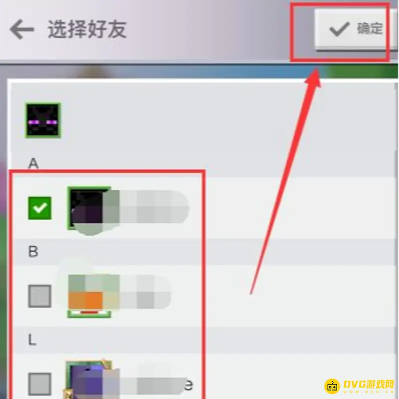 4.进入到发现好友页,选择好友,然后点击右上角确定,等待一会好友进入到房间
