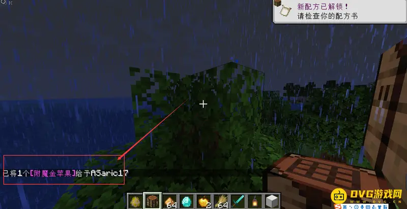 2、点击回车后,出现指令成功提示,即代表指令执行成功,玩家获得一个附魔金苹果: