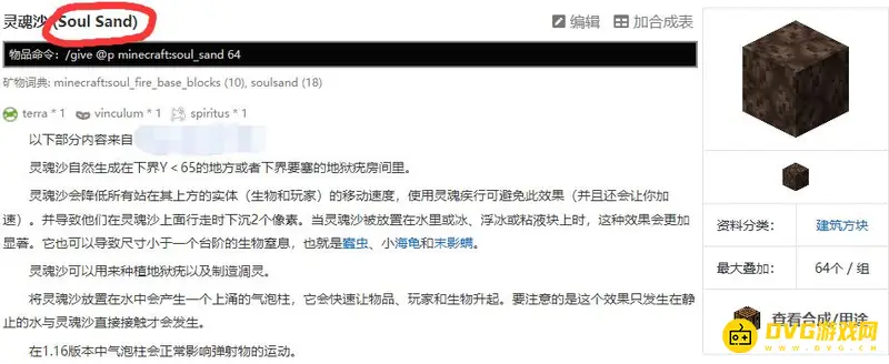 首先我们搜索并进入我的世界灵魂沙的相关说明,然后就可以在界面左上角发现,我的世界灵魂沙英文是Soul Sand。