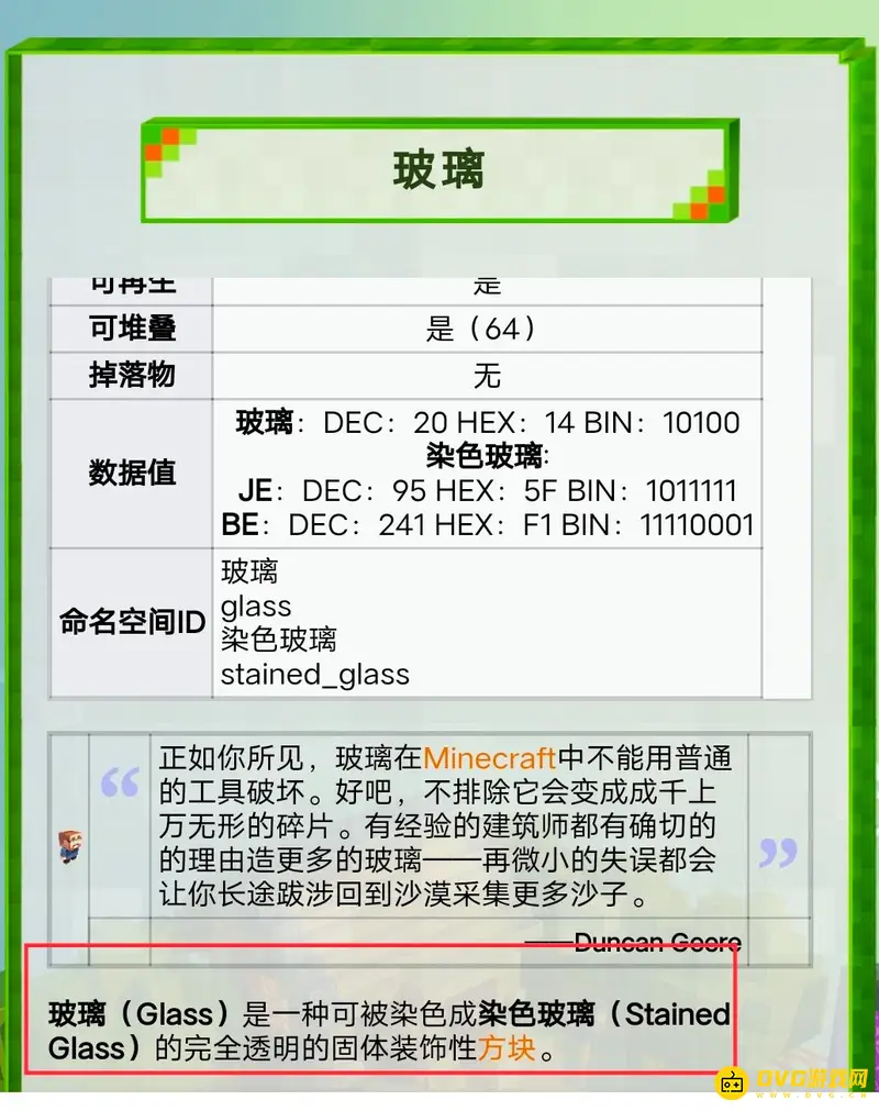 玻璃。玻璃是一种可被染色成染色玻璃的完全透明的固体装饰性方块。玻璃板作为村庄房屋的一部分自然生成。只有使用带有精准采集附魔的工具开采玻璃时才会掉落玻璃,否则不会掉落任何物品。