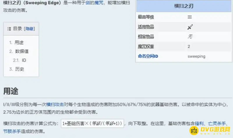 增加每一次横扫攻击对每个生物造成的伤害。在横扫之刃附魔1、2、3级后,对每一个生物造成的伤害额外增加50%、67%、75%的武器装备伤害,如下图所示,伤害计算公式为:基础伤害 × 魔咒等级 / (魔咒等级 1) 1。