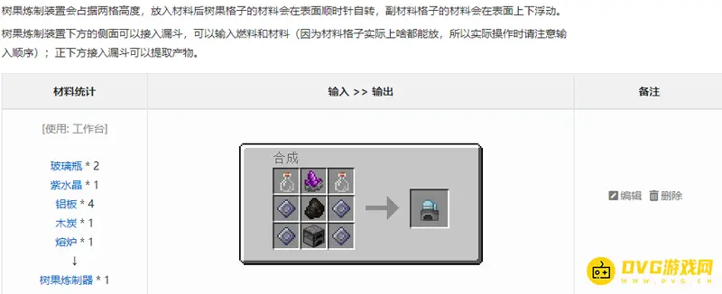 在游戏中,树果炼制装置的配方主要是玻璃瓶2个,紫水晶1个,铝板4块,木炭1个,熔炉1个。通过这些物品的搭配,就能用来合成玩家需要的树果炼制装置。