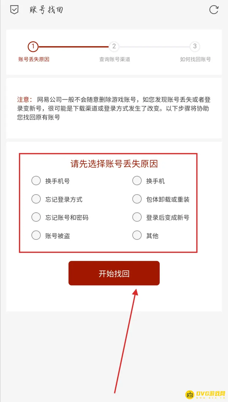 2、最后,选择账号丢失的理由,选择完毕后点下面的开始找回就可以了,如图所示