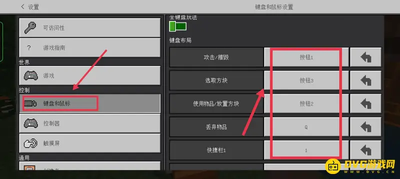 3、点击“键盘和鼠标”,你就可以在下图右侧窗口如图的位置自定义按键。