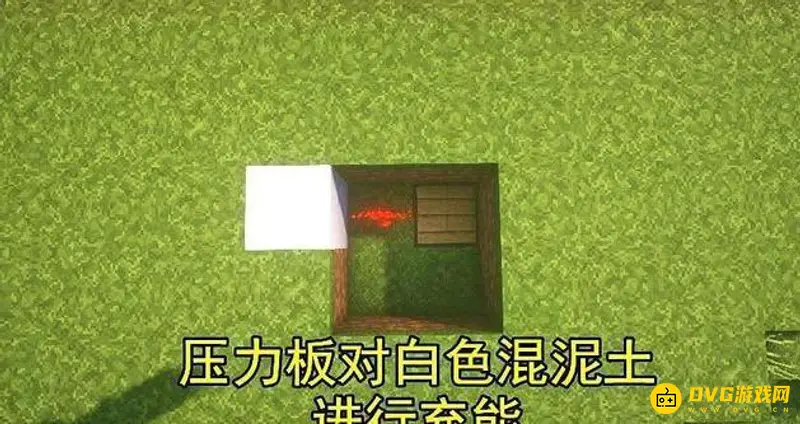 2、然后在深一格处放置一个云杉木栅栏,并倒入一桶【河豚桶】这个很重要,别的鱼都不行,切记!然后再放置一块压力板在其上,并撒下红石粉。压力板一旦被触发,红石能量将会通过红石粉对左侧白色混泥土进行充能。