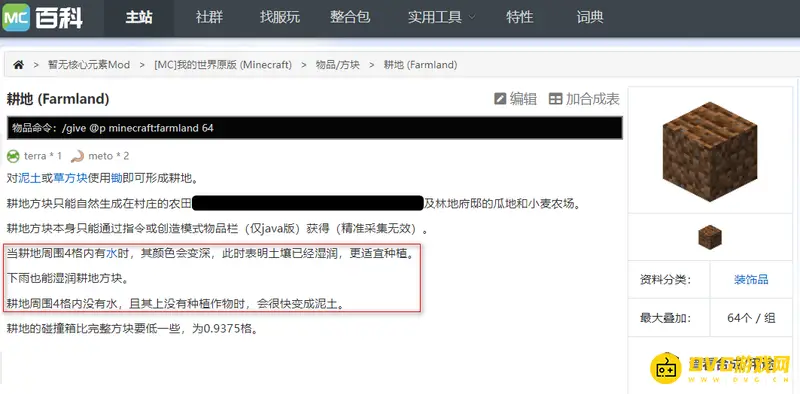 当耕地周围4格内有水时,其颜色会变深,此时表明土壤已经湿润,更适宜种植。下雨也能湿润耕地方块,耕地周围4格内没有水,且其上没有种植作物时,会很快变成泥土。