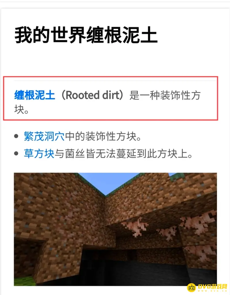 缠根土壤是一种装饰艺术格子,起装饰设计功效,可以通过使用专用工具或者是途手收集获得。类似于碎石土,真菌和草方块很难涌向缠根土壤上。绿色植物也不可以被摆放在缠根土壤上边,如下图所示。