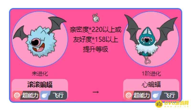 在我的世界中,神奇宝贝滚滚蝙蝠是的进化方式比较特殊,如下图所示,需要亲密度220以上或友好度158以上,并进行等级提升后即可进化成心蝙蝠。