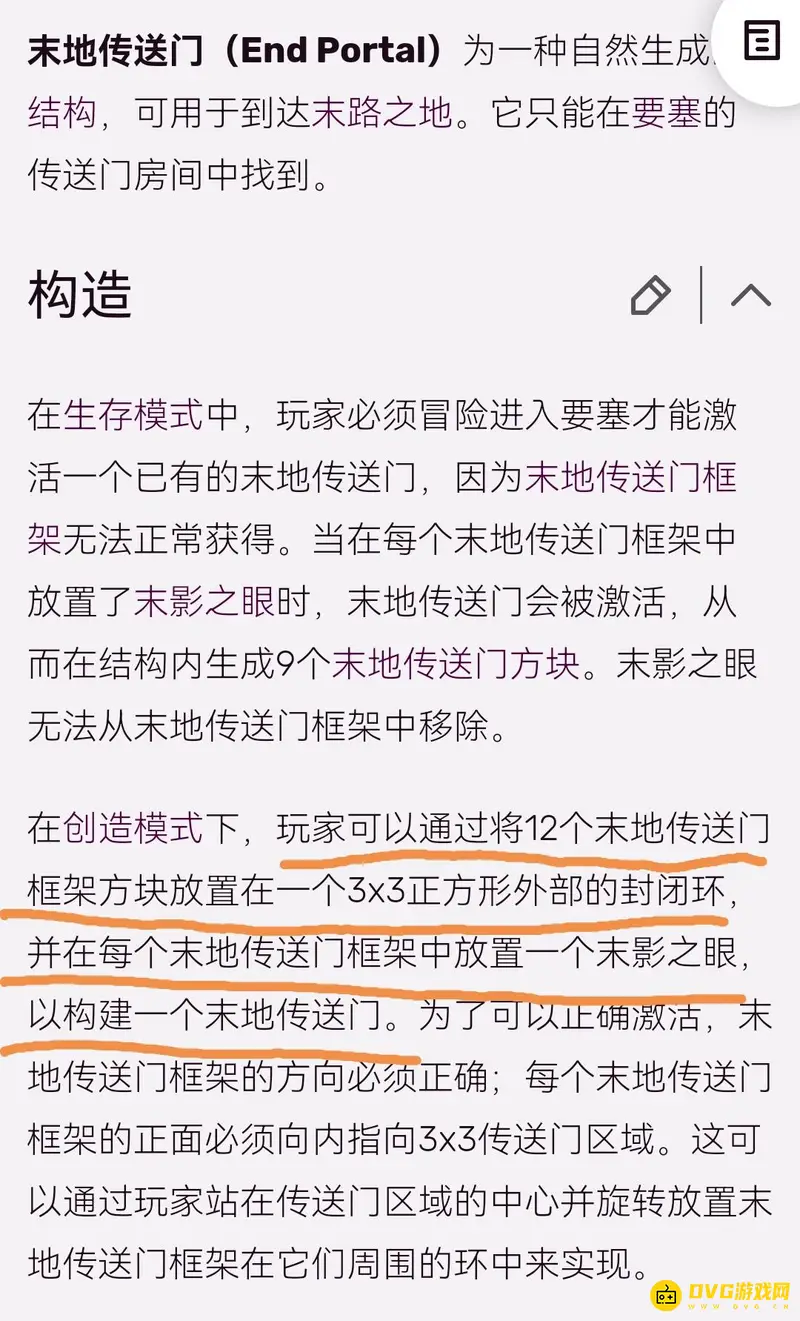 玩家可以通过将12个末地传送门框架方块放置在一个3x3正方形外部的封闭环,并在每个末地传送门框架中放置一个末影之眼,以构建一个末地传送门。为了可以正确激活,末地传送门框架的方向必须正确;每个末地传送门框架的正面必须向内指向3x3传送门区域。这可以通过玩家站在传送门区域的中心并旋转放置末地传送门框架在它们周围的环中来实现。