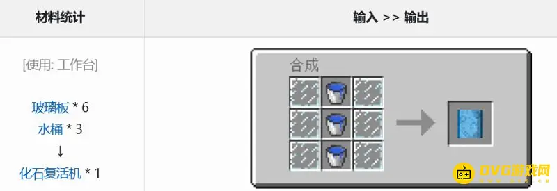 化石复活机是用6个玻璃板和三个水桶在工作台处进行合成的,我们把6个玻璃板分别摆在两侧,然后把三个水桶放在中间就能合成一个化石复活机。化石复活机和化石复活机机盖,化石复活机显示器,化石复活机基座合成化石机。化石机能够将各种化石孵化出来。