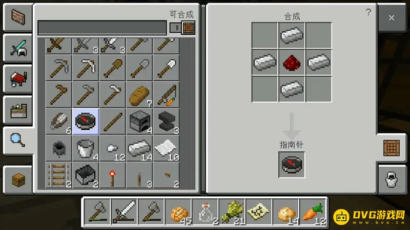 用指南针,指南针合成只需要四个铁锭和一个红石,将红石摆放在四个铁钉中间即可。这个指南针并不是指着南方,而是一直指着玩家的出生点或者床的位置。要一直跟着指南针的方向走,找到出生点或者床的位置,就能回去了。