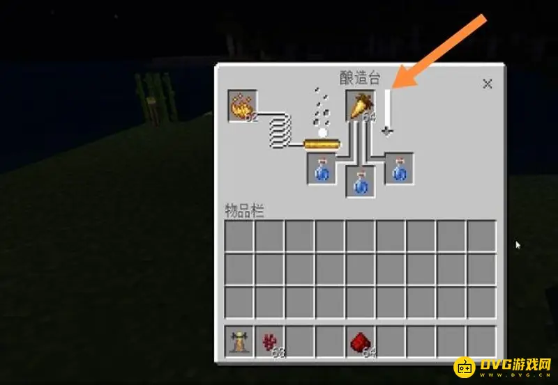 2.随后玩家右键点击酿造台,在酿造界面中,玩家要将下界疣放在最上面的空格中,而配料放置就是将烈焰粉放在左边的空格,最下面三格放水瓶,不一会就会酿造完成粗制的药水。