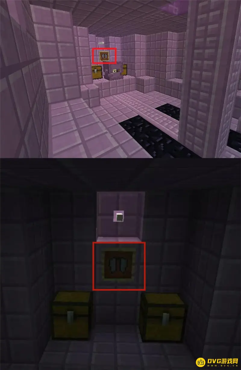 6、进入末影船内,在最高处就能看到墙上展示框中的鞘翅,两边是箱子,用手打掉鞘翅就能获得鞘翅了。