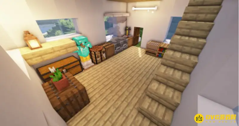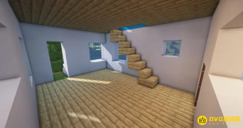 14、首先房子内用白桦木板铺设地板,然后搭建出连接一二层的楼梯。