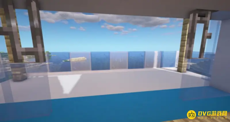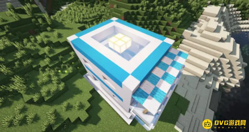 11、房子的顶部分别用淡蓝色混凝土、白色混凝土、淡蓝色染色玻璃、萤石灯/海晶灯搭建。