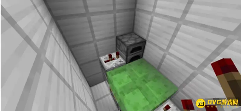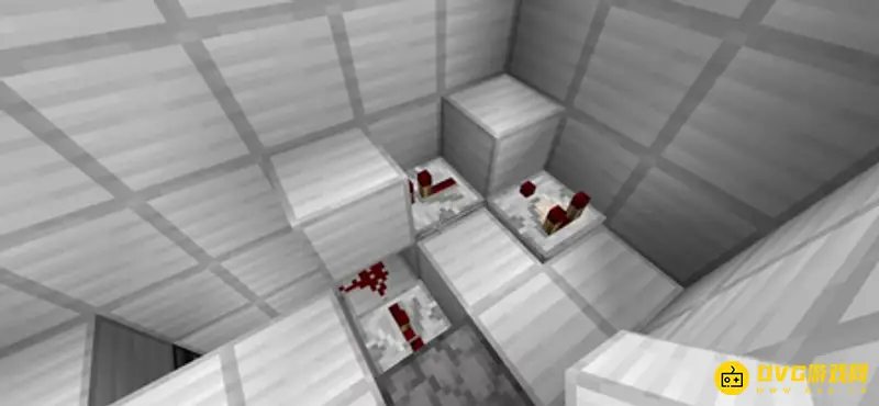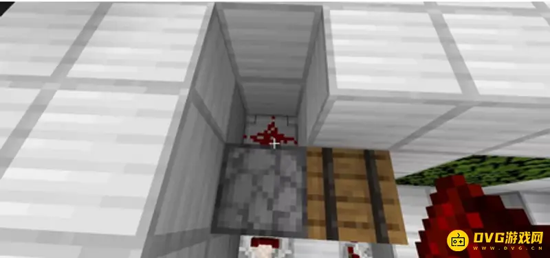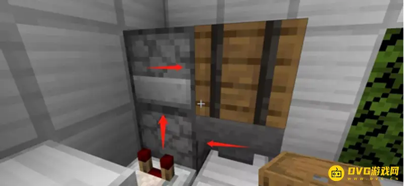7、接下来是开关的设置,由于这部分的布线因人而异,这里仅仅演示按钮控制的方法,首先挖开放置拉杆的那面墙。如图放置中继器和比较器。